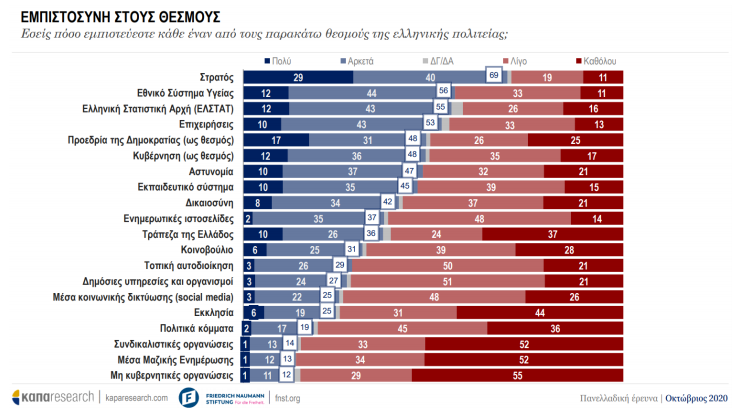 Ο θεσμός που συγκεντρώνει το υψηλότερο ποσοστό εμπιστοσύνης των πολιτών είναι ο στρατός με 69%. Ακολουθεί ο πίνακας με τα αποτελέσματα της έρευνας: